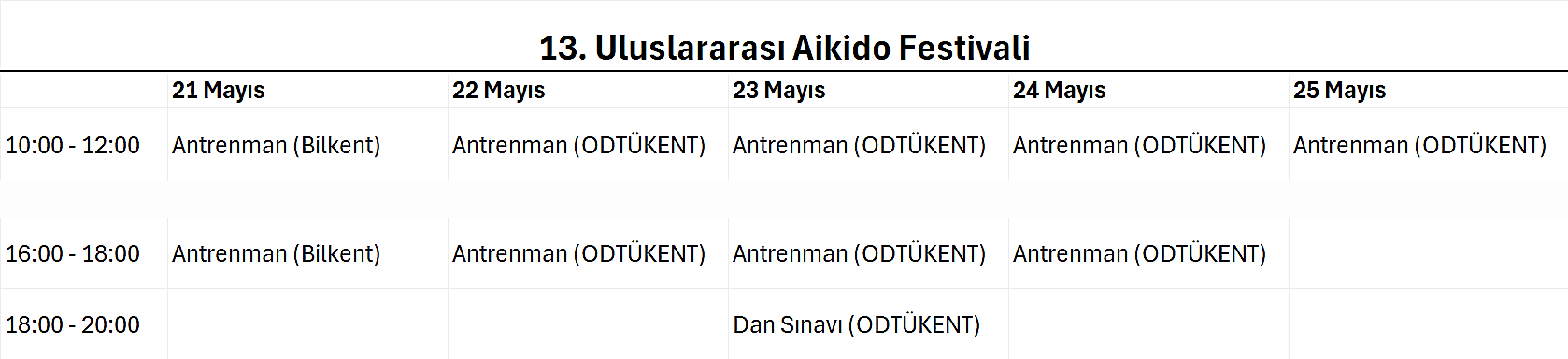Festival boyunca bütün dersler ve 23 Mayıs Cuma günü saat 18:00’de başlayacak olan dan sınavı tüm seyirciler için ücretsizdir. Aikido Festivali için gelen herkes ODTÜKENT Spor Merkezi’ne girebilir ve festivali izleyebilir.